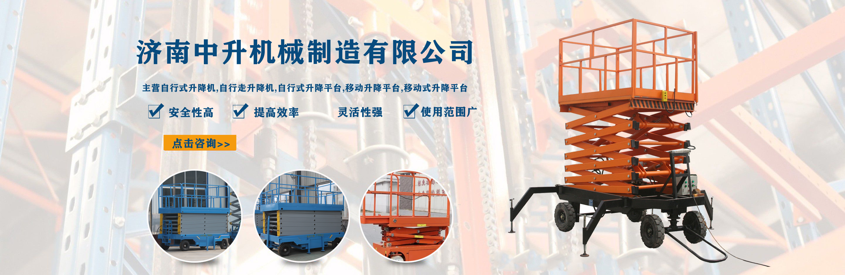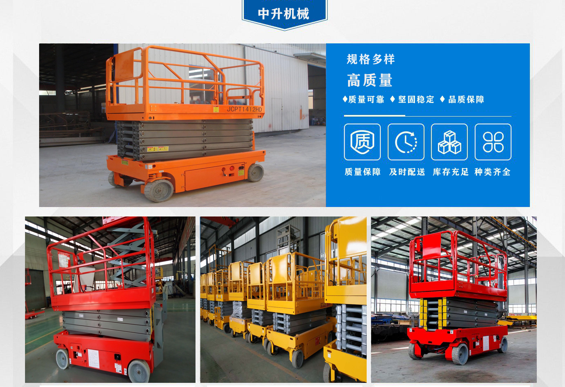 濟南中升機械制造有限公司主營自行式升降機,自行走升降機,自行式升降平臺,移動升降平臺,移動式升降平臺等產品,產品廣泛用于廠房維護、工業安裝、設備檢修、物業管理、倉庫、航空、機場、港口、車站、加油站、體育場、展覽館等多種行業和場所,  公司設備精良、工藝合理、檢測手段齊全,技術力量充足,公司創立伊始即本著“專注、專心”的經營理念,依托技術團隊優勢和設備硬件保障,全力打造良心的升降平臺企業?! ∥夜臼冀K以“品質為本,服務至上”作為企業宗旨。只要你訂購了我公司的產品,無論你身處何方,我們都會及時派出技術人員為你服務!...